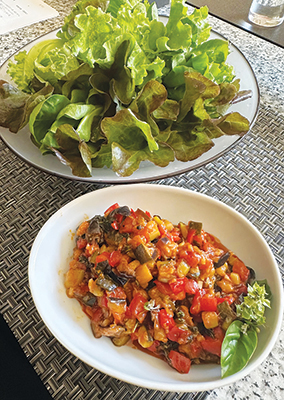 夏野菜を粗みじん切りにして、オリーブオイルとともにとろとろになるまで柔らかく煮込み、クラッカーや食パンにのせてオードブルスタイルに、またプリーツレタスにはさんで、ワインとともにいかがでしょうか。