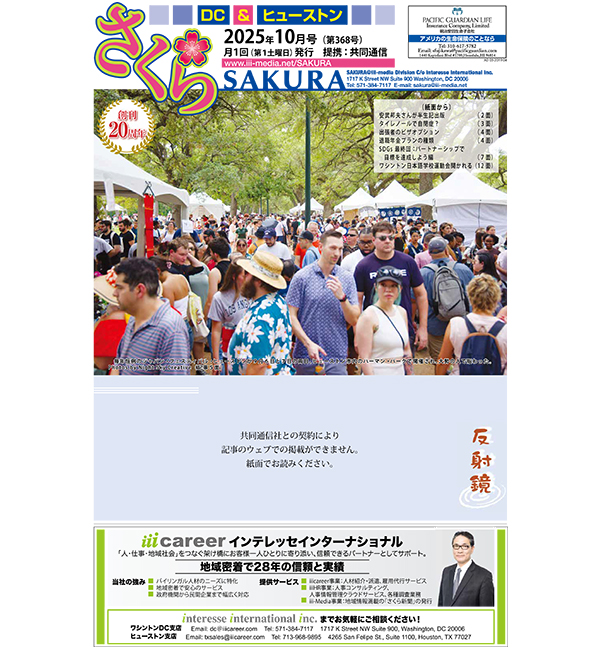 Home デジタル版 2025年10月号(第368号) デジタル版 2025年10月号(第368号) October 3, 2025 FacebookTwitterPinterestWhatsApp 今月のデジタル版を読む 紙面から 安武邦夫さんが半生記出版 (2面) 出張者のビザオプション (4面) 退職年金プランの種類 (4面) SDGs 最終回:パートナーシップで目標を達成しよう編 (7面) ワシントン日本語学校運動会開かれる (12面)